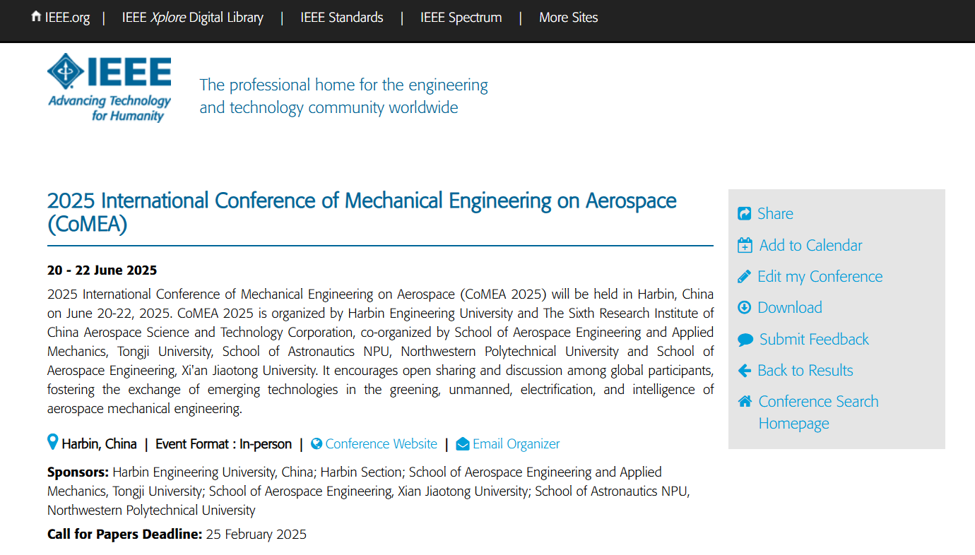 2025 International Conference of Mechanical Engineering on Aerospace (CoMEA 2025) is organized by Harbin Engineering University and Academy of Aerospace Propulsion Technology which is scheduled to be held in Harbin, China on June 20-22, 2025. It encourages open sharing and discussion among global participants, fostering the exchange of emerging technologies in the greening, unmanned, electrification, and intelligence of aerospace mechanical engineering.
