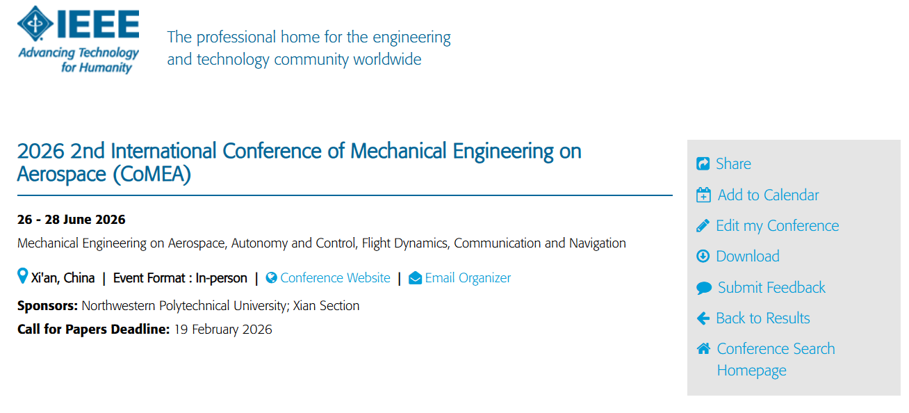 2026 2nd International Conference of Mechanical Engineering on Aerospace (CoMEA 2026) is organized by Northwestern Polytechnical University, hosted by School of Astronautics NPU, Northwestern Polytechnical University, and National Key Laboratory of Solid Rocket Propulsion, technically co-sponsored by IEEE and IEEE Xi’an Section. The conference is scheduled to be held in Xi'an, China on June 26-28, 2026. It encourages open sharing and discussion among global participants, fostering the exchange of emerging technologies in the greening, unmanned, electrification, and intelligence of aerospace mechanical engineering.